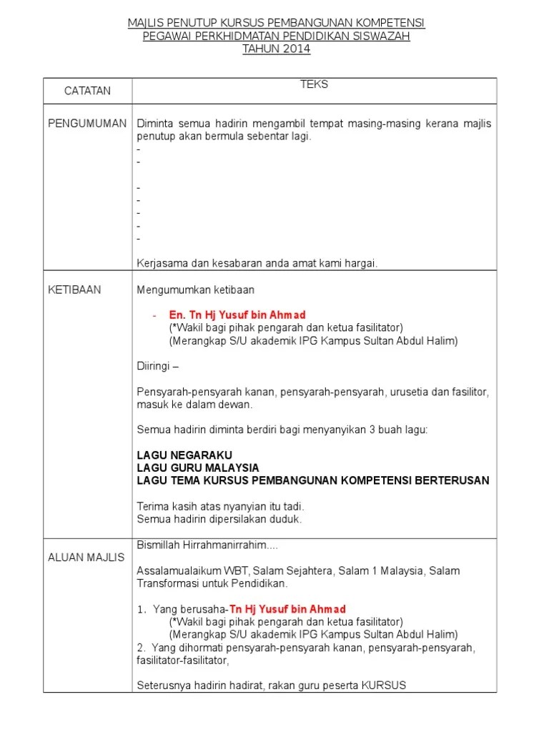 Text of teks pengacara kursus kepimpinan. Salam sejahtera dan selamat pagi. Majlis dengan segala hormatnya menjemput yang berusaha ust. Catatan teks pengumuman diminta semua hadirin mengambil .